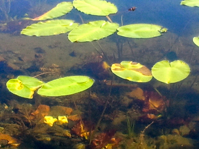 Yesterday, the lake was perfectly calm and I wandered early along its shoreline and into the shallows, snapping photos of water lilies, the water so clear I could see all the way down to their roots.