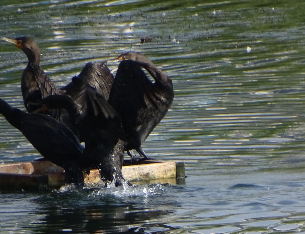 Cormorants hang out in groups, perching on logs, rocks and the abandoned nesting platforms of red-necked grebes. In the early morning, they often sit with their wings spread wide and motionless, a good drying technique.