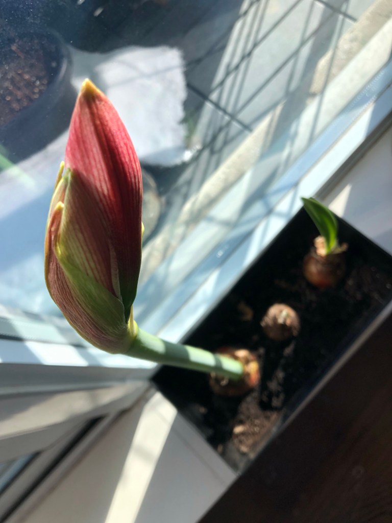 It’s been four weeks since I brought the bulbs into the light. The largest of the bulbs, the mama, is about to bloom. All the smaller bulbs are in various stages of sending out leaves.