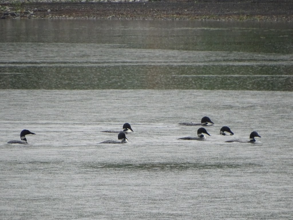 Turns out loons sometimes come together in large groups, summoning one another with a call that sounds like a hoot. They may even fly in from nearby lakes, hanging out together for a while, letting down their territorial guard. There are studies and speculation about why they do this but the research isn’t conclusive.