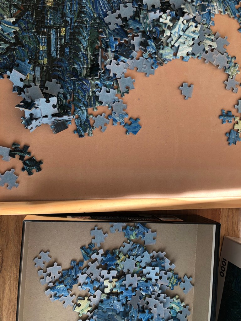I also wondered what to do with it next, having no compulsion to frame it. For me, puzzles are more activity than art. I make them because they require something from me – concentration, time, determination. In return, I am rewarded with the pleasure of clarity; of seeing so many pieces join together, creating an image that is not only beautiful, it’s orderly. Peaceful.